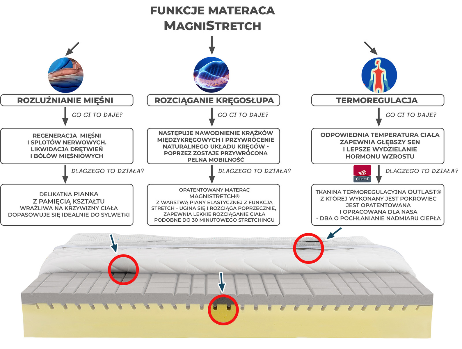 Materace Magnistretch posiadają zestaw trzech kluczowych dla jakości snu i regeneracji skutecznych funkcji. Połączone razem funkcjonalności powodują, że Magnistretch jest rozwiązaniem unikatowym.